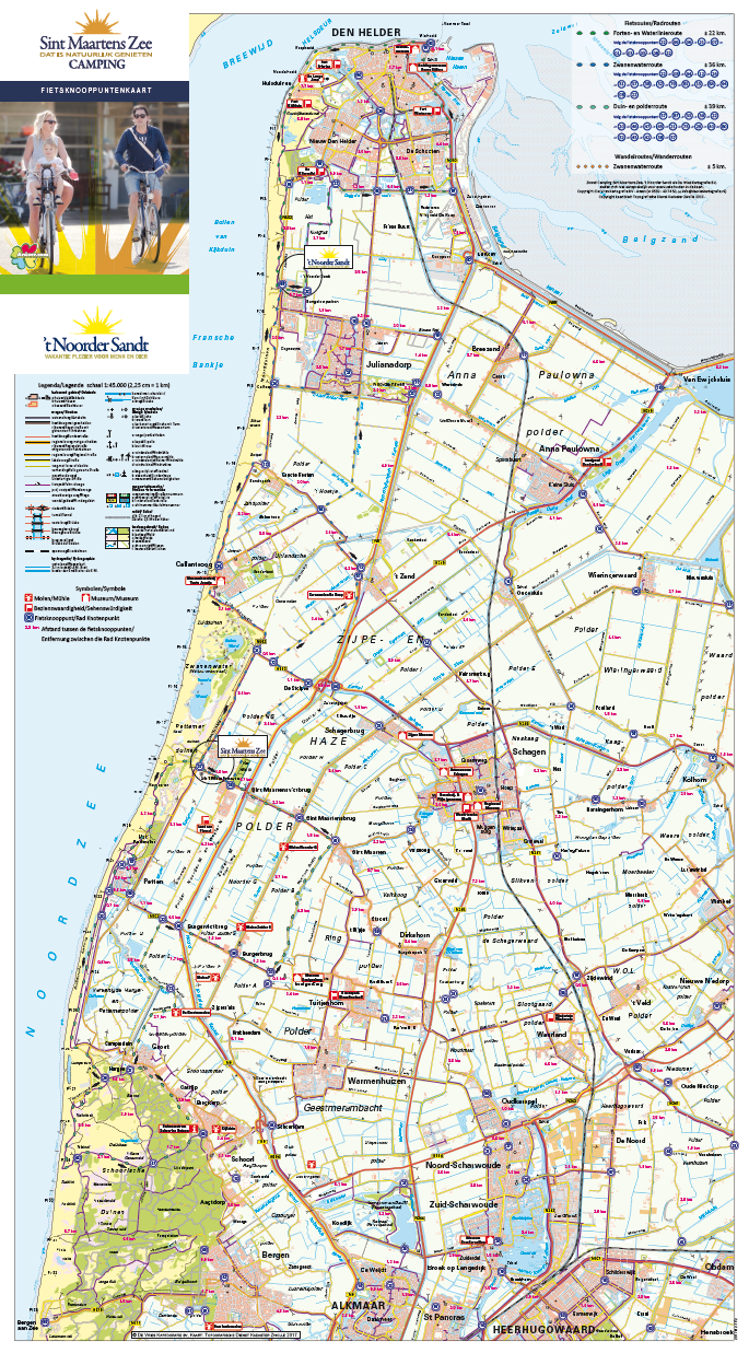 De gebruikte basiskaart voor de fietsknooppuntenkaart is een topografische kaart schaal 1:50.000, die verschaald is naar de schaal 1:45.000. De topografische kaarten zijn aangepast aan de fietsende gast van Camping Sint Maartens Zee en ’t Noorder Sandt. De fietskaart is voorzien van drie fiets knooppuntenroutes en één wandelroute. Deze fietsroutes voeren de gast langs mooie plekjes in de duinen en dorpen in de Kop van Noord Holland, waaronder Callantsoog, Groet, Sint Maarten, Julianadorp en Den Helder. De fietskaart is uiteraard voorzien fietsknooppunten en de afstanden in kilometers tussen de fietsknooppunten. De fietsknooppuntenkaart Noord-Hollandse Kust is ook voorzien van symbolen van bezienswaardigheden en attracties in deze regio.