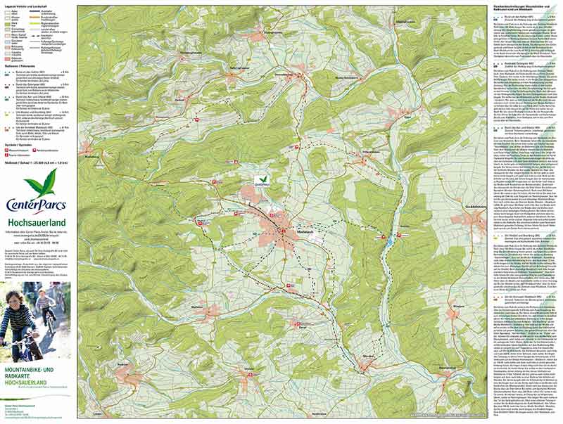 De fietskaart is voorzien korte met kinderen geschikte fietsroutes tot en met uitdagende mountainbike route rondom Medebach in het Hoch Sauerland.