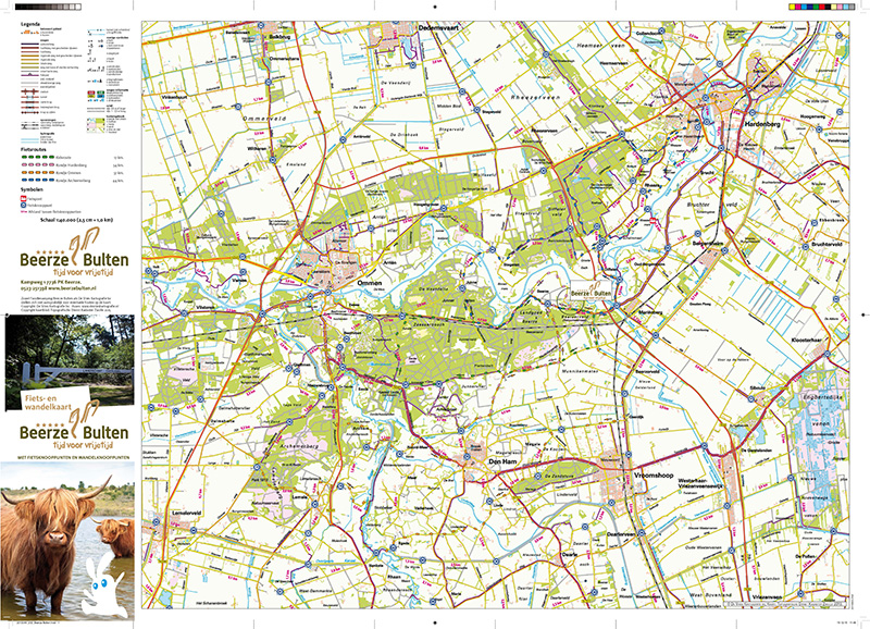 De gebruikte basiskaart is een topografische kaart schaal 1:50.000, die verschaald is naar 1:40.000. De topografische kaart is aangepast aan de fietsgast `Beerze Bulten. De fietskaart is voorzien van 4 fietsroutes door het Vechtdal, waarvan 1 kinder fietsroute. Uiteraard is de fietskaart voorzien van fietsknooppunten en afstanden in kilometers tussen de fietsknooppunten. Op de achterzijde van de fietsknooppuntenkaart staat de wandelkaart Vechtdal afgebeeld met het wandel netwerk door de omgeving van Landgoed Beerze, Junne, Diffelerveld, Den Ham, Ommen en het Zeeserveld. De wandel netwerkkaart is uitgevoerd in de schaal 1:22.500 (4,5cm. op de kaart is 1,0km in het veld). Uiteraard is de wandelkaart voorzien van de wandelknooppunten. De fietskaart / wandelkaart is dubbelzijdig in full color bedrukt.