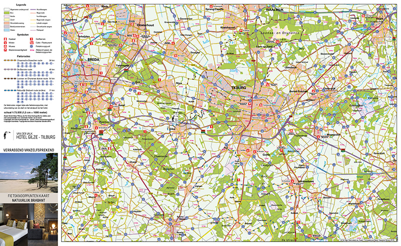is aangepast aan de kleuren voor Van der Valk Hotel Gilze Tilburg. De fietskaart is voorzien fietsknooppunten en de afstanden in kilometers tussen de fietsknooppunten en diverse fietsroutes,